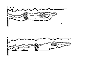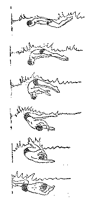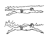 滑行与开始游泳蹬壁后,身体成流线型在滑行中转成俯卧(如下图),当感觉到速度下降时,开始打腿并接着划水升到水面游。
