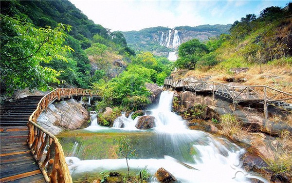 大丰门溯溪,一般是从大丰门水库出发,沿着溪流逆水而上,走到溪水源流,一路上尽是险滩、乱石,清泉潺潺。其中,落差达88米的锦绣大瀑布,就像一条巨龙从天而降,气势磅礴,在悬崖峭壁的撞击下,飞入鳄鱼潭激起惊涛骇浪。景区内还有4300米的峡谷亲水步道,依山取势,可以让人零距离地亲近那一潭碧幽、听闻山泉叮咚。