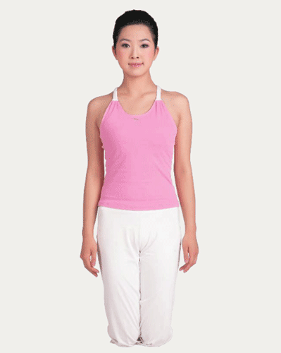 2、吸气,右腿伸向右方,让右脚与左膝处于同一条直线上,右脚尖指向右方,右膝不要弯曲。双臂上举,双掌与头顶合十。