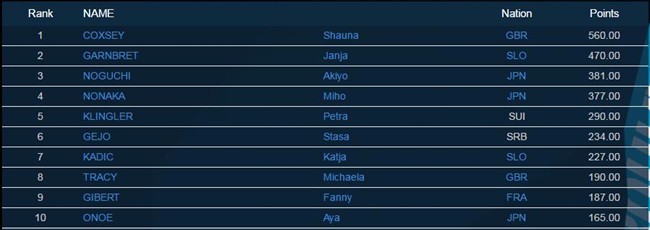 女子方面,本届赛季一直保持巅峰状态的英国大妞Shauna Coxsey以560分总成绩夺得总冠军,遥遥领先亚军Janja Garnbret100多积分,今年当之无愧的“抱石女王”。在女子前十排位中,日本战队依然有不俗成绩,3、4名及第10名均来自日本。