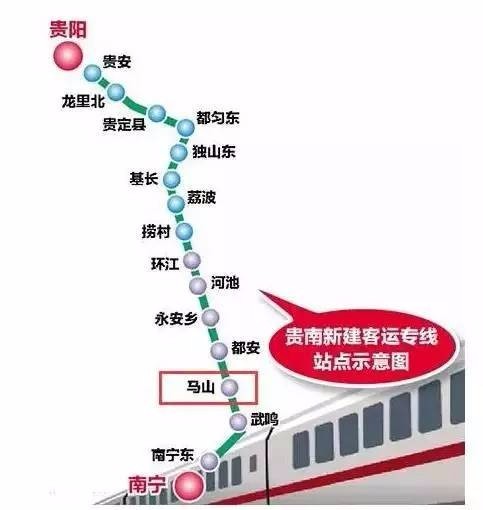 连接贵州和广西的第二条高铁客运专线已于2016年12月29日在都安县开工建设,工期6年(至2022年)全线共有15座车站,其中也包括马山。也就意味着马山不再是高山、峭壁,出行不便,而是迎来了高铁时代。真正进入了南宁"一小时"经济圈。