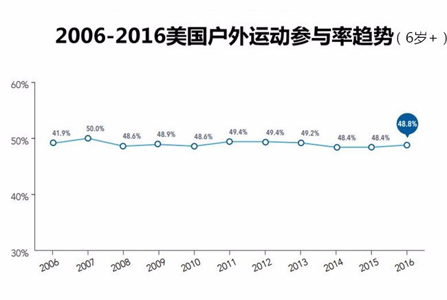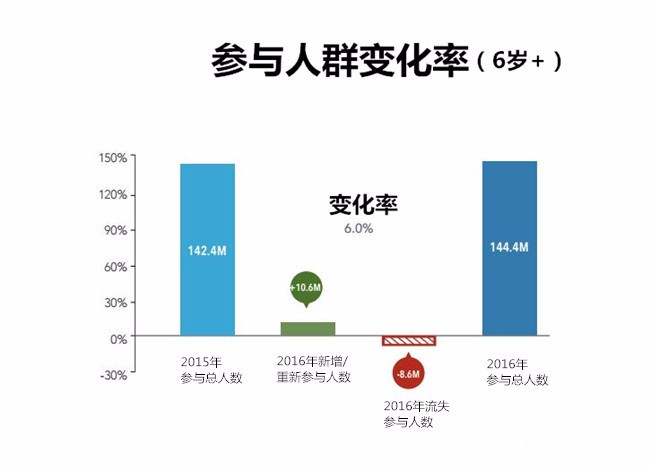 2016年,1060万美国人重新或开始参与一项或多项户外运动,同时约有860万人口不再参与户外运动,这相当于净增200万户外运动参与人数,即6%的变化率;