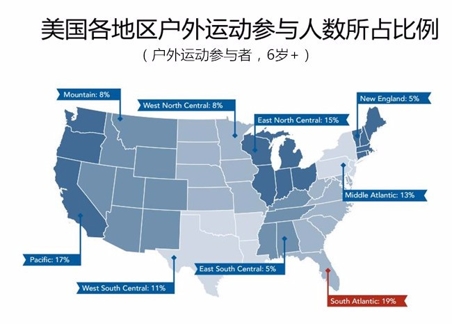 19%的美国户外运动参与者生活在美国南大西洋地区,是美国户外运动参与人群最多的地方;