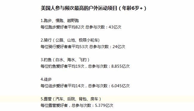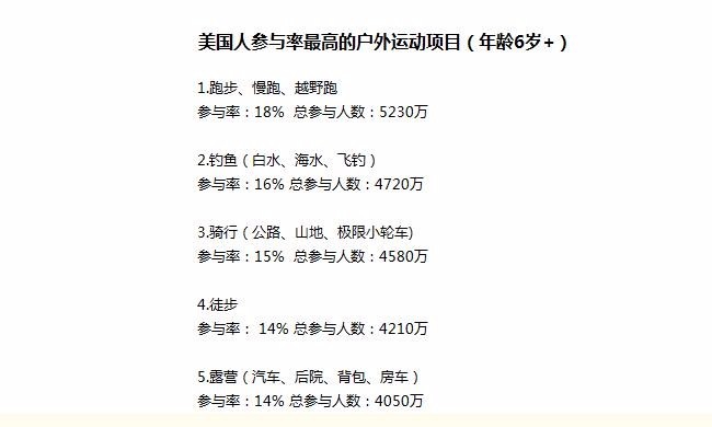 无论从参与人数还是参与频次来讲,跑步(包括慢跑和越野跑)都是最受美国人欢迎的户外运动项目;