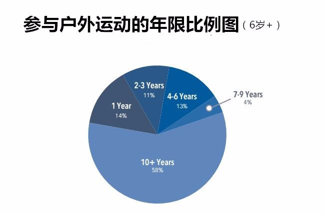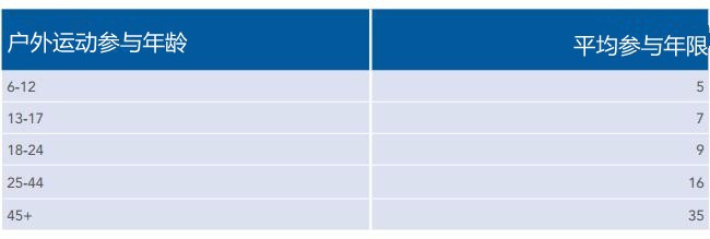 2016年,美国的户外运动参与者平均享有21年的户外经历。 数据显示,如同预期,户外运动参与者的年龄越大,往往参与户外活动的年限就越长,事实上,这些年龄在45岁以上的美国户外运动参与者,他们户外经验也平均在35年以上。