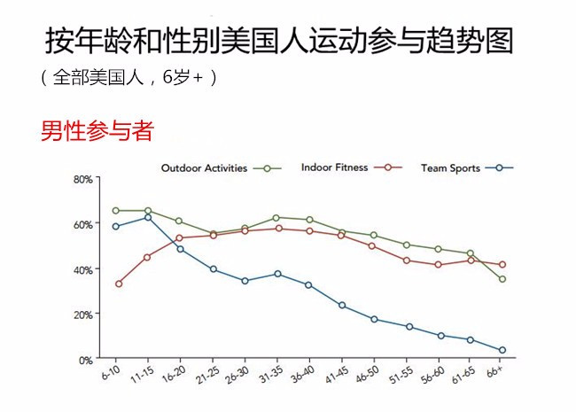 如上图,美国人户外活动参与频率各不相同。积极者方面,21%的参与者每周至少享受两次户外活动。 而不积极的,32%的参与者最多每个月参与一次户外活动。几乎一半的美国人比较积极地参与户外休闲活动,每年参与次数在12-103次之间。