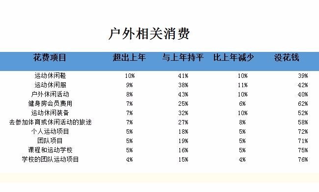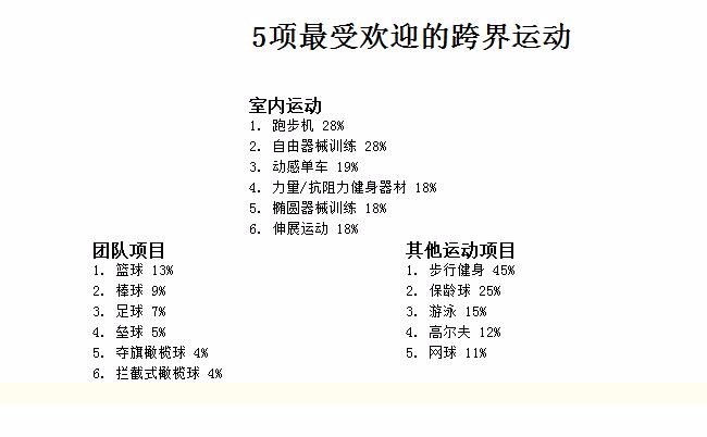到目前为止,健行是交叉跨界参与最多的项目,45%的户外运动参与者也步行健身;