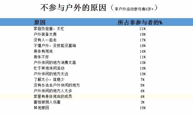 在这些户外运动参与者中,21%的每周至少参与两次户外运动;