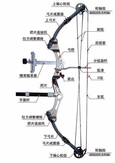 b、现代复合弓:现代复合弓最大的特点就是运用了滑轮来达到省力的效果。现代复合弓分为狩猎复合弓和竞技复合弓;轴距小的是狩猎弓,大的是竞技弓。