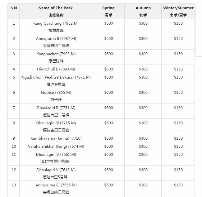 18.向银行提交的费用中包含相应山峰的登山许可申请费用。具体费用见下表: