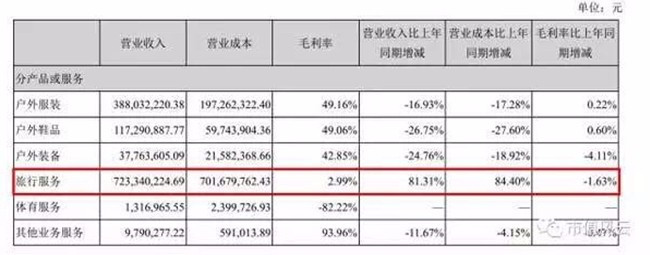 2015年探路者的38.08亿营收、净利润2.63亿里,户外事业群贡献了2.87亿净利润,旅行事业群营收20.04亿,但归母净利润仅-2286万,2016年旅行服务板块更是营收同比减少41.61%,大幅亏损。