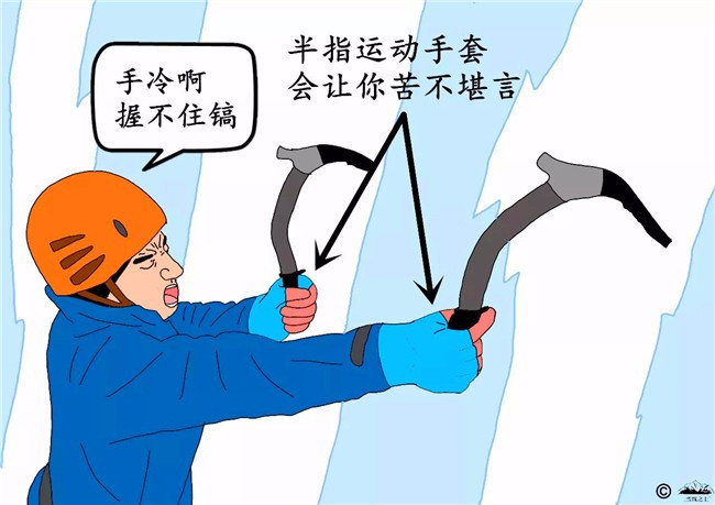 手套——如果你攀冰时没戴手套,或者戴了一双不防水的手套,很快手指就会冰冷刺骨,手指僵硬还可能会造成无法握住冰镐。