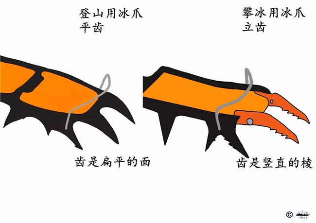 选择卡式立齿冰爪——攀冰时需要频繁地踢冰,所以冰爪需要稳固有力。对冰爪的要求主要体现在穿戴方式和前齿的形态上。