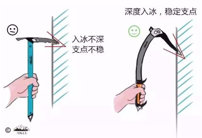 为什么用“弯”镐——冰镐有弯直之分,面对陡峭的冰壁,需要使用弯曲的技术冰镐做钩挂牵引,以此完成攀登。