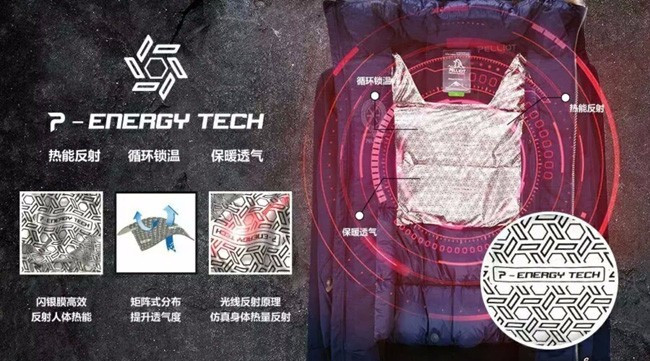 P-ENERGYTECH是伯希和2017年最新开发的保暖科技,并应用到了羽绒服等产品上,保暖性比同类产品提高20%,闪银膜高效反射人体热能,形成保温层,隔绝寒冷入侵,减缓热量散失,大幅强化保暖性能。