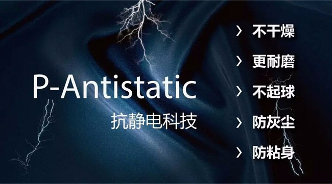 在服饰中加入P-Antistatic抗静电科技,经过特殊的抗静电处理后,面料会更加柔软,不再干燥,更耐磨,抗起球。静电的消除便避免了服饰粘身、灰层吸附等问题,防止秋冬天气干燥产生静电干扰。