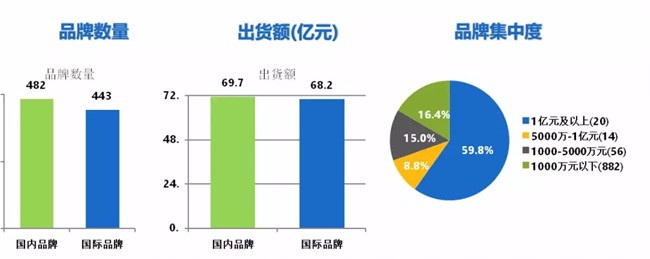 在市场中的品牌总量有所减少,过亿品牌数量从22个降为20个,总市场份额提高到59.8%。市场集中度进一步加强。部分专业品牌增长较快。而低端品牌在实体渠道受网络冲击较大,优势不再显著,关店较多;同时更多中高端品牌在电商渠道发力,也抢占部分市场;