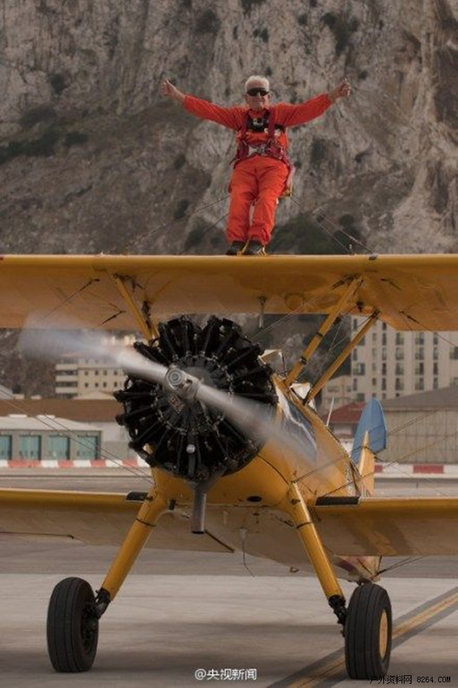 英国94岁的老人汤姆-拉基站在一架双座飞机的机翼上绕直布罗陀岩山飞行2圈,凭此壮举他成为世上年龄最大的机翼行走者。他还拥有多项世界纪录,这次94岁的他完成人生又一个目标。