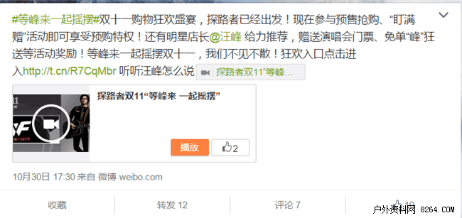 探路者老总盛发强,圈内有名大咖,为人沉稳低调,虽然微博没有动静,但探路者天猫旗舰店大幅广告明摆着已战斗在即。