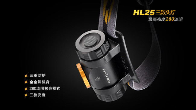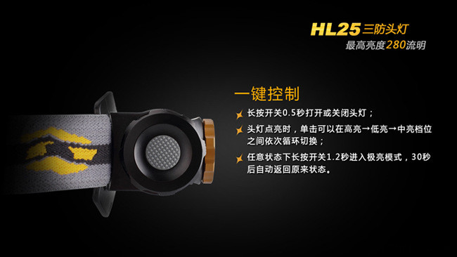 另外HL25采用的是一键控制设计,具体操作为:长按开关0.5秒打开或关闭头灯;头灯点亮时,单击可以在"高亮-低亮-中亮"三个档位间依次循环切换;任意状态下长按开关1.2秒进入280流明极亮模式,30秒后自动返回原来状态。