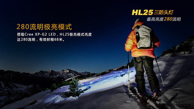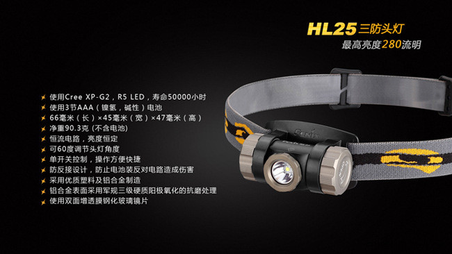 HL25使用最新的CreeXP-G2LED,三个亮度档位,能充分满足不同的使用环境。在紧急情况或寻路时,即可调出280流明极亮模式。