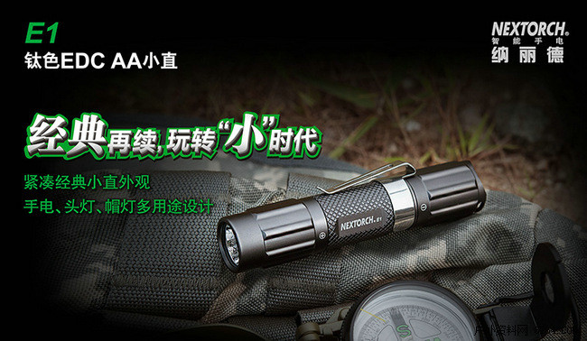 2008年,纳丽德推出小型直筒手电X1,并一度成为EDC(EveryDayCarry)控的掌上玩物,收藏控不可割舍的宝贝。目前,X1虽已停售多年,却从未在EDC控的世界里消失,经典的三段式小直身板,富有质感的钛色外衣,细腻的细节处理,一直被筒友津津乐道。如今,E1经典再续,在X1的基础上赋予了最新的手电技术,同样小巧的身板有着更大的能量,更多细腻的设计,更多把玩的乐趣,和你一起玩转"小"时代。