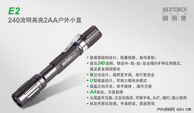 E2是一款240流明高亮2AA户外小直。紧凑的直型结构设计,免去了常规手电筒头较大,不易携带的困扰;专门针对户外照明的聚泛光设计,让视野更开阔,夜行更安全;尾盖正向开关,一键实现轻触点射、模式切换及双击爆闪,单手握持,操作方便;经典三段式设计,头尾盖可互换,形成正向或反向抱夹,拓展手电用途;配备精美不锈钢夹、手绳、电筒套,便携随行;U型尾盖设计,可倒立做烛光模式。E2是您户外出行、日常便携的绝佳选择。