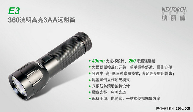 大脑袋、强核心,体态丰满、握感舒适,E3是一款主打远射的高亮3AA实用手电。采用CREEXP-G2R5LED,最高亮度360流明;49mm大光杯设计,拥有260米超强远射能力;大面积侧按反向开关设计,操作舒适、方便;预设中-高-低三种常用模式,满足更多照明需求;尾盖可倒立设计,做营灯使用;配备手绳、电筒套,便携随行;E3是户外搜索、日用巡逻的理想选择。