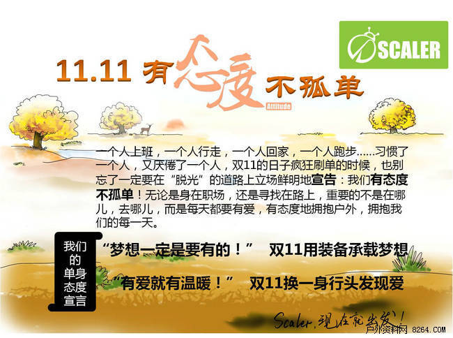 双11的日子疯狂刷单的时候,也别忘了一定要在"脱光"的道路上立场鲜明地宣告:我们有态度不孤单!无论是身在职场,还是寻找在路上,重要的不是在哪儿,去哪儿,而是每天都要有爱,有态度地拥抱户外,拥抱我们的每一天。