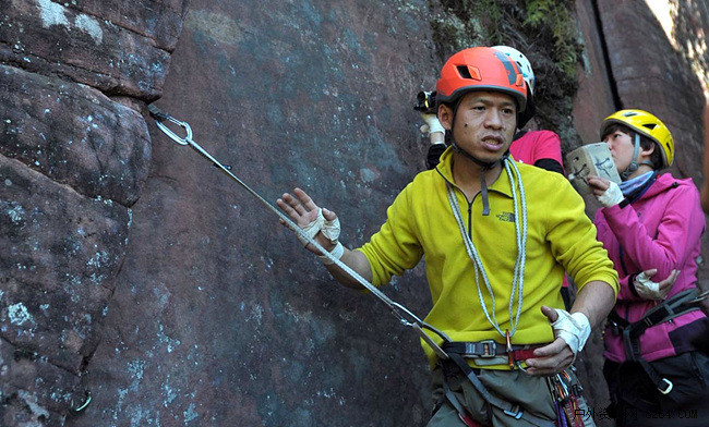 来自中国登山协会攀岩攀冰部的曹荣武教练在攀爬中