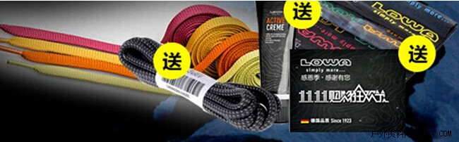 专业LOWA鞋带、户外时尚头巾、精美情侣T恤、护理保养剂大批好礼正在来袭,买就送满就送抢就送,让你拿到手软!