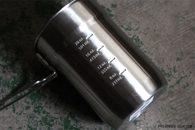 根据体型,我觉得叫杯子更好点,虽然它就是锅。造型很简洁,一侧是品牌LOGO,一侧是刻度,均为冲压成型的。而外表面看起来也没有什么涂层之类的,不锈钢的表面给人的感觉是简单且可靠。