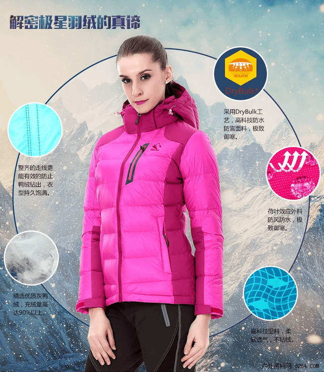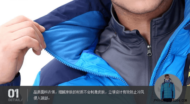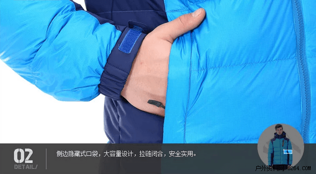 此款羽绒服的面料为15D尼龙*0.15格涂层仿绒锦纶布,100%锦纶;充绒为灰鸭绒,含绒量90%,充绒量L码250克;防水透气等级为WP/MP=5000/5000。同时还有保暖舒适立领、可拆卸调节式防风帽、雷射切割装饰拉链安全胸袋、暖手双拉链插袋、安全内袋、可调节魔术贴袖口、可调节松紧下摆等特点,配置独立收纳袋,适合秋冬季登山、徒步、旅行和城市户外穿着。