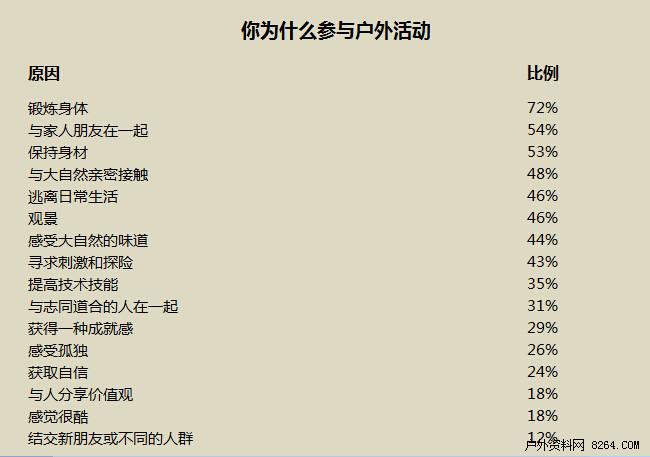 徒步健身是户外活动参与者交叉参与最多的户外项目,半数以上的人都喜欢徒步
