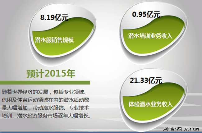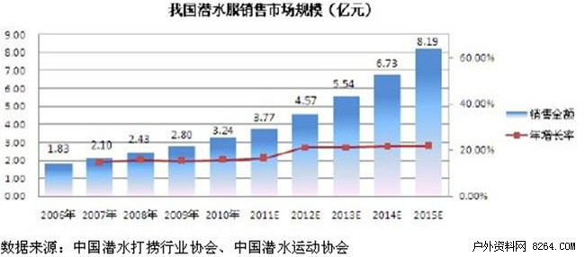 我国也已经成为潜水服市场的重要增长点,根据中国潜水运动协会及中国潜水打捞行业协会的调查分析,预计2011年至2015年我国休闲及体育运动潜水行业年均增长速度有望保持在30%以上,且潜水打捞行业年均增长速度有望保持在20%以上,为我国潜水装备市场的增长提供强有力的保障,到2015年我国潜水服销售规模将达到8.19亿元。