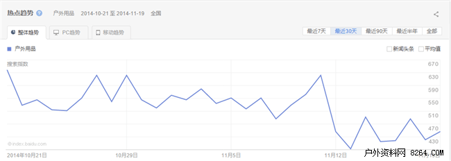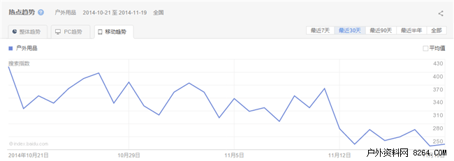 自进入十一月以来,户外用品的搜索量在双十一出现了一个小高峰,户外用品市场在此赶上了年底的消费小热潮。双十一过后热度明显回落,并出现近一个月中最低段。预计双十二户外用品热度搜索也迎来一股小的高潮,这也是品牌商年终冲刺的最后时机。