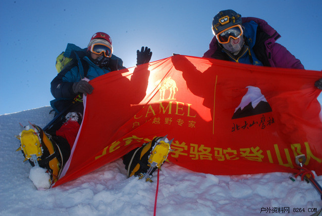 2014北京大学骆驼登山队本次的攀登目标锁定在位于青海省格尔木市唐古拉山乡境内的各拉丹冬峰。各拉丹冬雪山群,南北长达50公里,东西宽约20公里,冰雪覆盖方圆670平方公里,周围分布着40余条现代冰川。由于山体坍塌,这座山峰传统路线(西北山脊路线)的技术难度比队伍预期要高,换鞋处至C1遍布碎冰区,C1至C2路段则是大雪坡地形,间或少量裂缝,C2以上的线路较陡,一度出现70°的冰雪混合坡段。复杂的地形极为北大骆驼登山队的队员们提供了极好提升综合技术能力的机会。