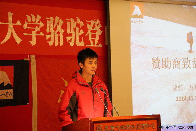 2014年11月14日晚7点,"北京大学骆驼登山队2014年各拉丹冬峰登山报告会"在北京大学英杰交流中心月光厅隆重举行。北京大学体育教研部副主任吴昊、山鹰社指导老师钱俊伟、北京大学骆驼登山队战略合作伙伴和指定服装赞助商CAMEL骆驼户外等赞助商代表、以及多家媒体朋友,出席了本次登山报告会。