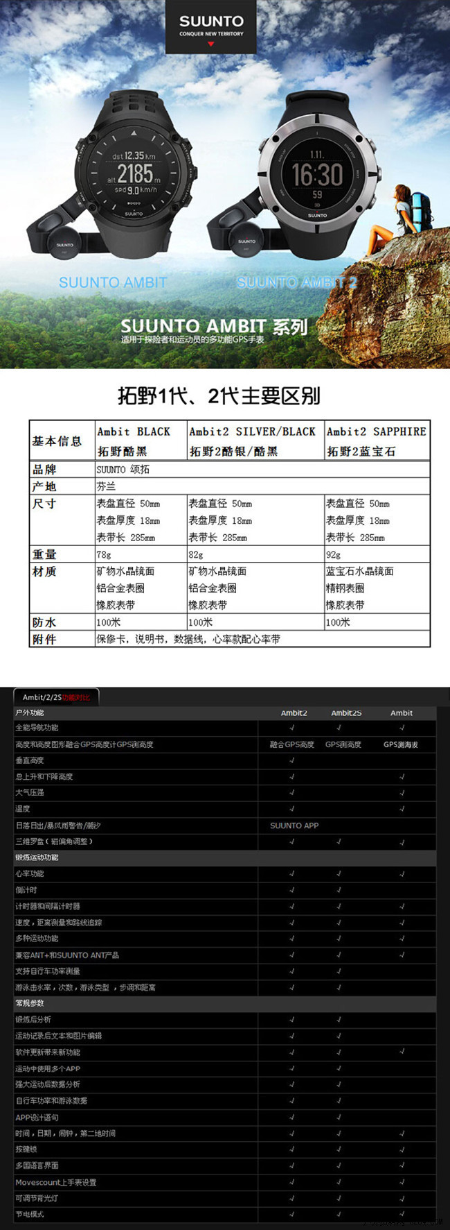 SUUNTOAMBIT颂拓拓野系列是每个热爱滑雪、徒步、越野跑和登山玩家渴望得到的一款户外利器,它融合了高科技GPS全球定位功能,独特的三维罗盘和高灵敏度的高度气压计,使你能够随时随地了解所处的方位,准确的高度和天气条件。申请专利的GPS定位功能使你迈出的每一步的数据(速度,距离)尽在掌握之中。SUUNTO颂拓--功能性户外腕上电脑领先者宣布推出新品AMBIT拓野系列,这将是首款真正的GPS全球定位腕上电脑。