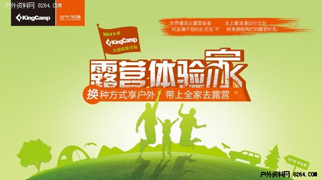 KingCamp:“2014年度KingCamp露营体验家”由露营体验师活动升级而来,是KingCamp连续举办3年的大型体验活动,KingCamp希望通过“换种方式去户外,带上全家去露营”的方式推动全家露营生活方式的盛行,户外绝不应局限于个体对自然的征服和探险以及对自我极限的挑战,而更应该是与家人一起到户外去,共同感受、相互分享户外运动所带来的快乐体验并把这种愉悦的心境传递给周围的朋友,去户外·学会爱!