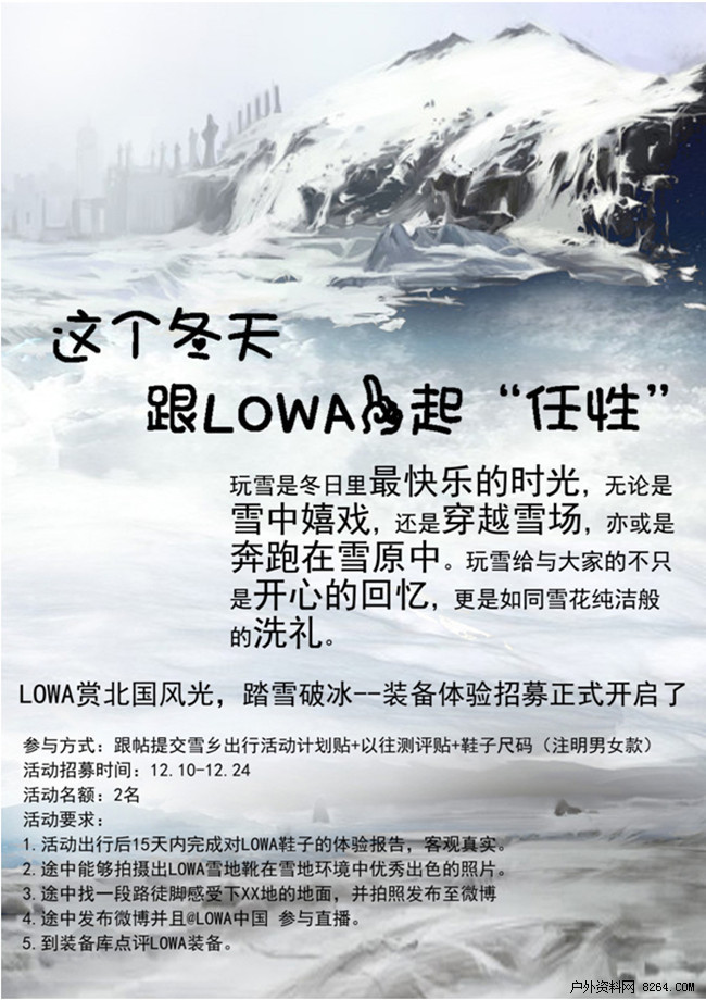 跟帖提交自己的雪乡出行计划(涵盖主要行程)以及以往测评帖就有机会获得LOWA君为大家准备的雪地靴体验的计划。