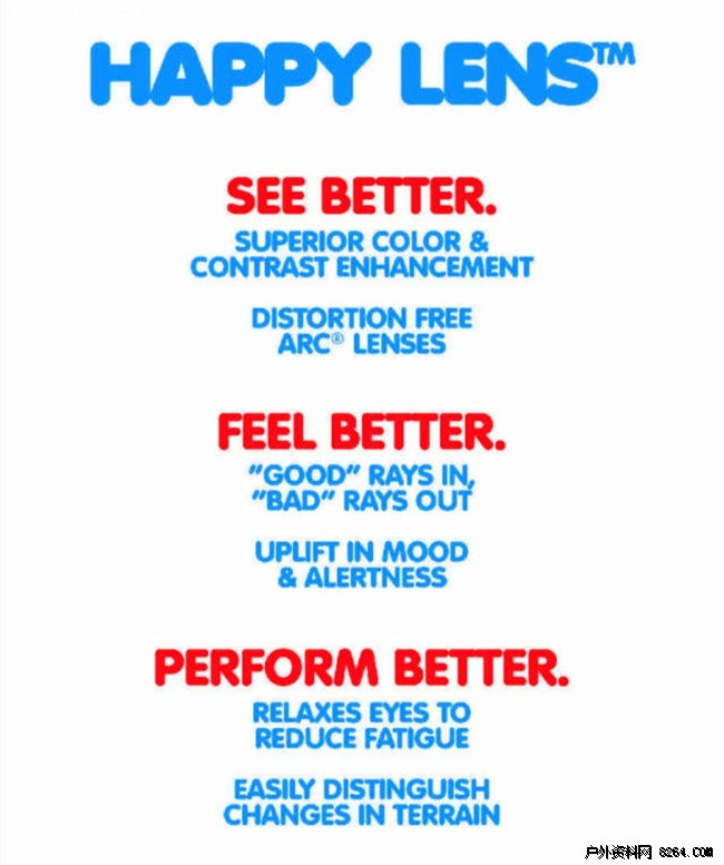 其专利的“Happy Lens”镜片技术,除了能够阻挡常规UVA/UVB对眼睛的伤害,更能够智能分辨光谱中的长波蓝光和短波蓝光,让“有益”光线(长波蓝光)通过,提升运动表现,愉悦情绪;同时有效阻挡“有害”光线(短波蓝光),保护佩戴者眼底和大脑不受光线刺激伤害。
