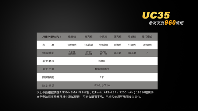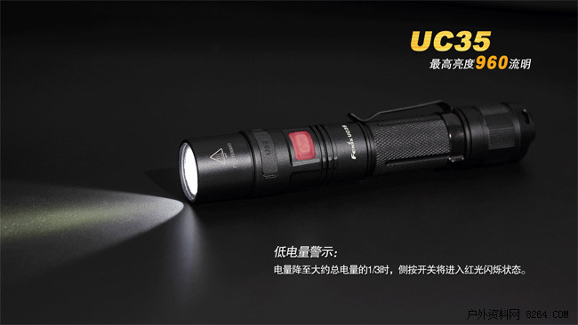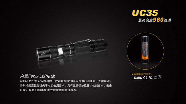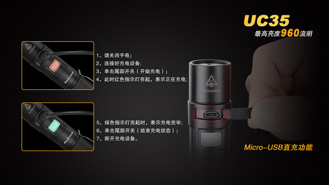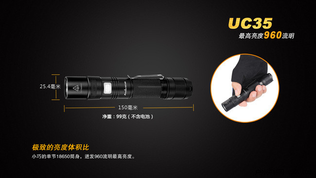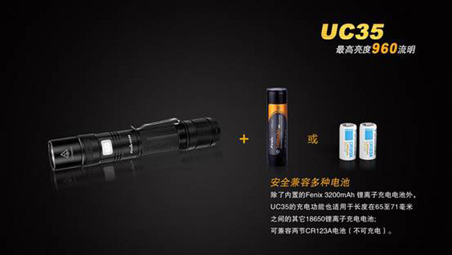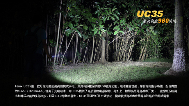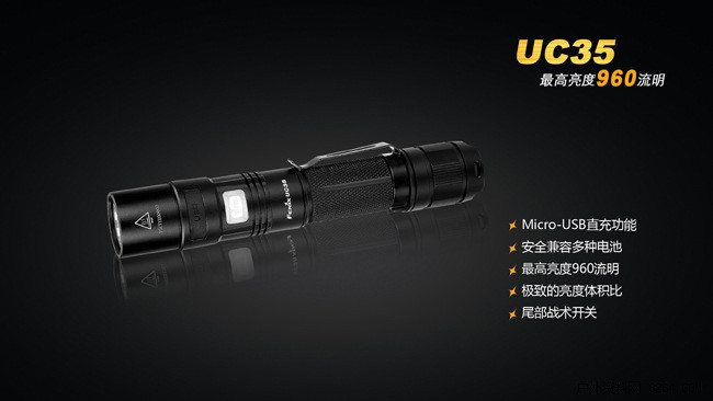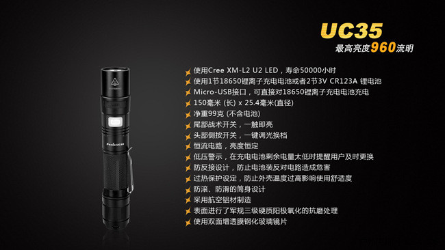 FenixUC35是一款具备直充功能的超高亮便携式手电。其颈部的Micro-USB强防水接口,配合充电指示灯和内置的Fenix18650高性能充电电池,为UC35提供高质量的电源保障;配备尾部战术开关,一触即亮,头部侧按一键控制五档亮度和爆闪模式;再加上960流明最高亮度以及IPX-8级防水能力,UC35可以胜任从日常家用、户外活动到搜索救援、战术应用等多种场合的照明需求。
