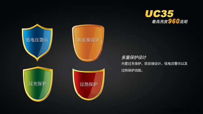 虽然UC35已内置Fenix的安全3200毫安时的18650锂离子充电电池,但是广大用户在使用过程中难免会使用其他质量参差不齐的18650锂离子电池,这就为手电的安全提出了更高的要求。鉴于此,UC35内置了防过充、防反接、低电压警示及过热保护功能等多重保护设计,真正做到了在使用过程中安全无忧。