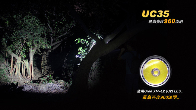 另外,UC35搭配的是一颗CreeXM-L2(U2)LED,最高亮度960流明,拥有5档亮度和爆闪模式。在使用14流明节能档时,最长续航时间为150小时。长按调光侧按键1秒即可进入960流明的爆闪模式,在紧急情况下可使目标短暂致盲。