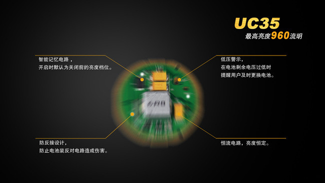 FenixUC35拥有极致的亮度体积比,不仅如此,UC35还以其首屈一指的高效率电路见长。恒流电路能让手电的亮度恒定;智能记忆电路,能让手电开启时默认为关闭前的亮度档位;低压警示,在电池剩余电压过低时会进行闪烁提醒。而防反接设计则可避免电池反接对电路造成伤害。