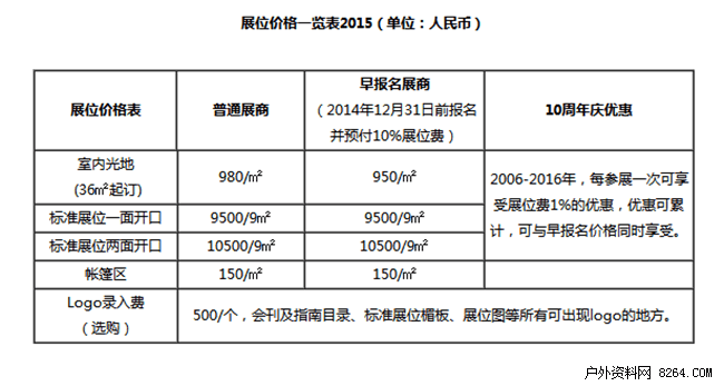 2015年将迎来亚洲户外展十周年庆,展会将推出一系列优惠活动,在2014年12月31日前报名并预付10%的展位费更可同时享受早报名和十年庆的双重优惠。早报名优惠只剩最后一周了,机不可失,欢迎大家尽早报名。有关各项优惠详情请见附件“2015亚洲户外展价格表”。