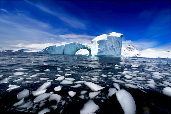 (南极半岛西尔瓦湾的洋面常年有冰山漂浮,这些浮于水面的部分往往只是整个冰山的十分之一,是名符其实的冰山一角。图中这座冰山正在日照下逐渐断裂消亡,冰面融化形成了一座壮丽的天生桥。)