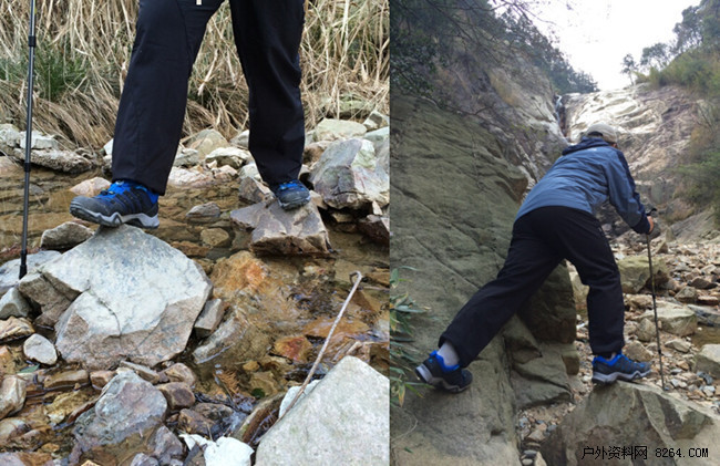最后来说一下这双鞋的鞋底,采用的是TRAXION鞋底科技,外表是不规则的巧克力状的冬季奇钉大底,表现中规中矩,但是它却让你足够安心,放心。结合了CONTINENTAL马牌橡胶大底,马牌大家应该都知道,豪车宝马的轮胎大都适用马牌,他的特点就是稳定性好,抓定力和耐磨性都是一流,两者相结合,就位这双大底配备了超强的抓地力和摩擦力。为此笔者专门去爬山道的青苔石阶和湿滑的溪流石内折腾了一下,抓地力确实强劲,是这双鞋的一大亮点。
