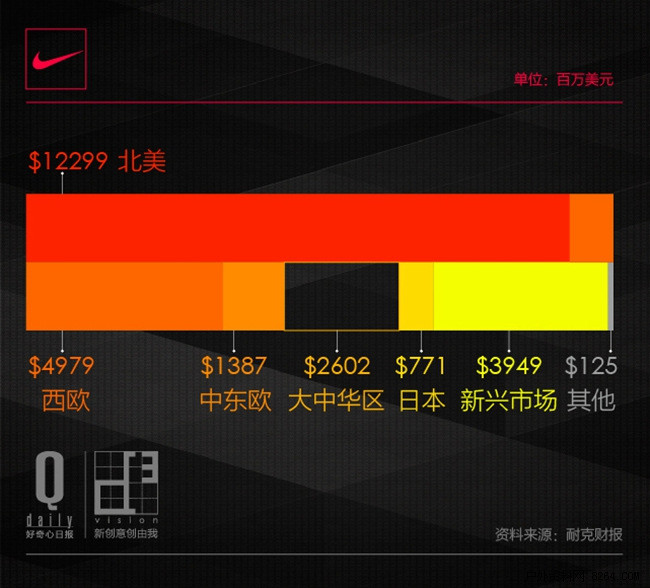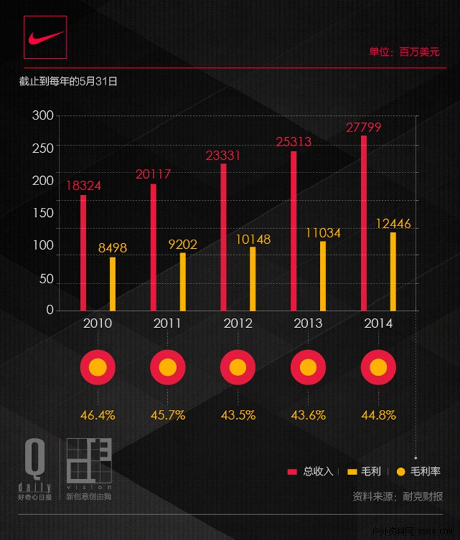 2014财年,耐克总营收277.9亿美元,净收入26.9亿美元,比去年上涨9.29%。去年可能是耐克有史以来表现最好的一年。分析师认为这家公司的成功得益于Flyknit 等高利润产品的推动。此外,在2014年财报中,阿迪达斯、专注瑜伽运动的LuluLemon、拥有The North Face 的VF 集团等依然是耐克传统的竞争对手。